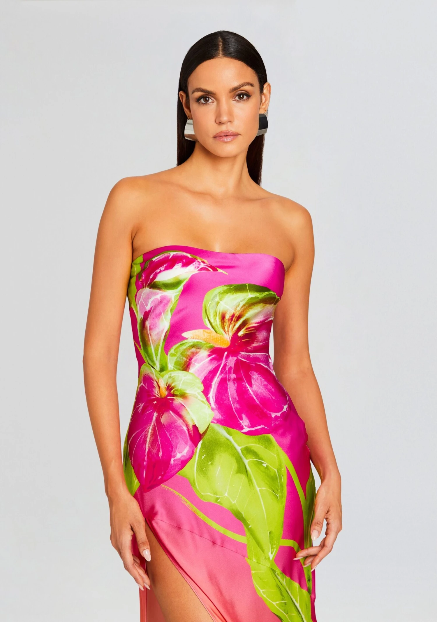 Dive into a world of vivid elegance with our Aiyanna Dress. This dress boasts a body-hugging silhouette in luxurious silk, offering a blend of sophistication and comfort. The vibrant multicolored pattern of this dress brings a playful yet elegant touch to any event, allowing you to express your unique style effortlessly. The strapless neckline adds a modern chicness, while the high slit infuses an element of allure, ensuring you make an entrance wherever you go. Shown here in Ombre Anthurium.
