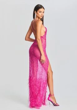 Steal the spotlight in our Alessandra Dress. This sheer maxi style features bright pink embellishments, a thigh slit and barely there straps. The silhouette is finalized with a zippered back and a feathered hem. Shown here in Knockout Pink.