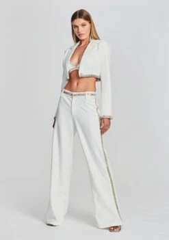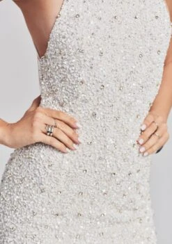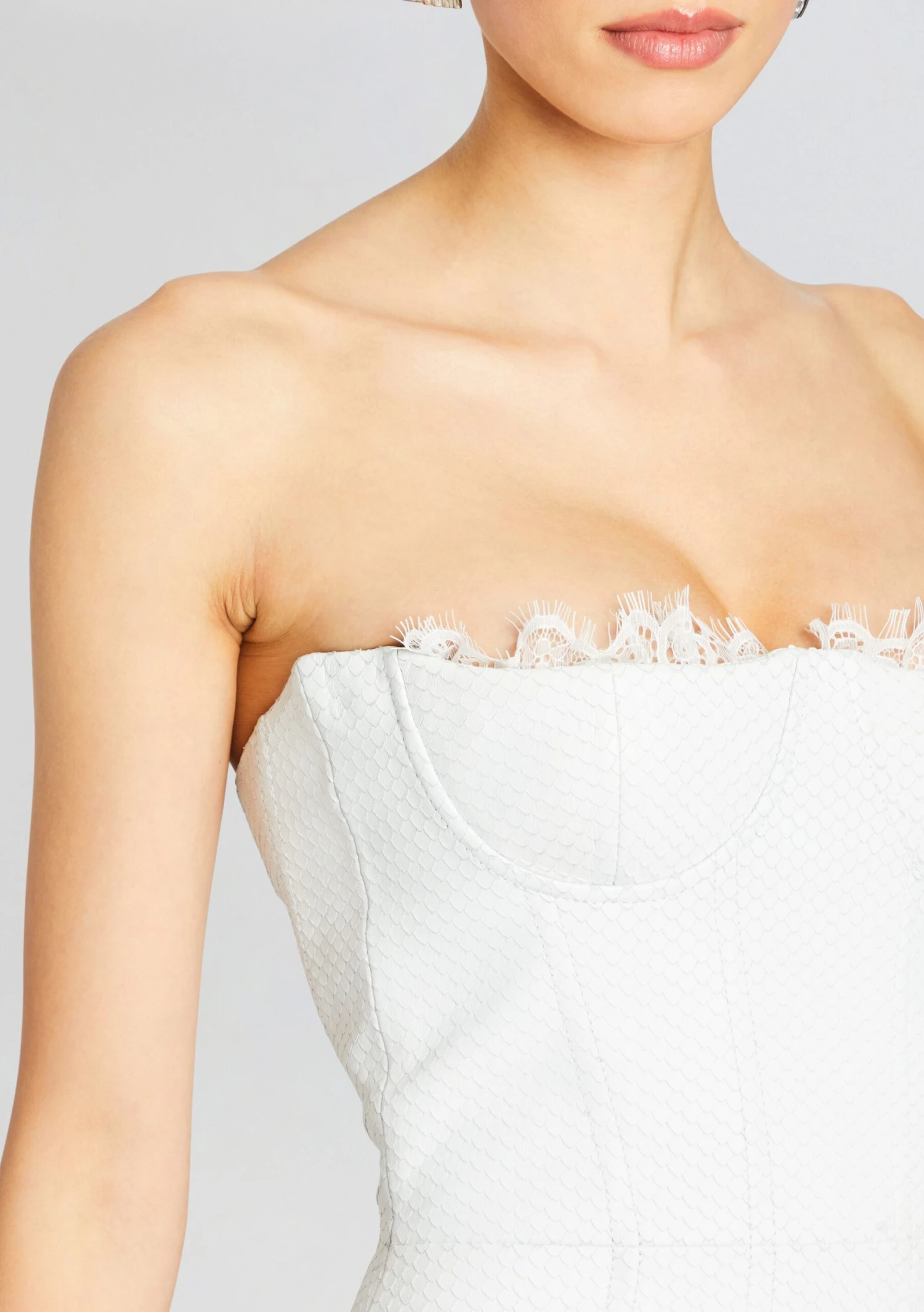 The Amberly Dress is a strapless stunner designed to enhance your confidence while turning heads with its unique reptile leather texture, ultra flattering fit and alluring lace accents. Shown here in White.