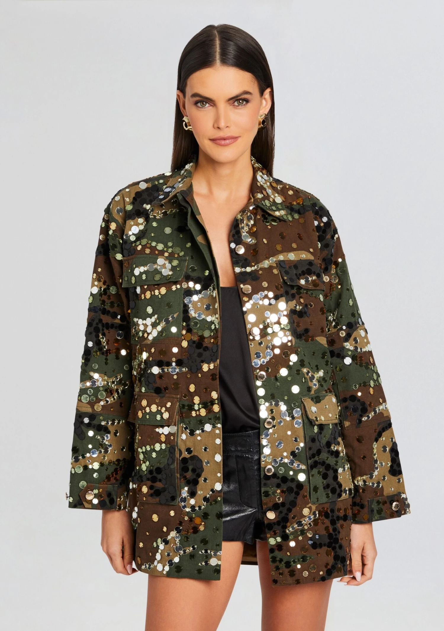 Introducing the ultimate statement – our Arlie Jacket. This jacket seamlessly combines cool and edgy style, featuring a captivating camo pattern adorned with dazzling sequin embellishments. With convenient pockets for added functionality, it’s the epitome of fashion that’s both trendy and unique. Shown here in Camo.