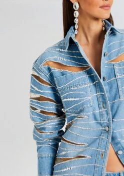 Revolutionize your denim game with our Avani Shirt, a must have for fashionistas seeking a unique blend of casual and couture. This statement piece is not your average denim jacket — it’s a masterpiece featuring two chic front chest pockets adorned with dazzling sequin embellishments and strategically placed sheer cutouts for an edgy yet sophisticated look. Shown here in Bondi.