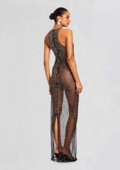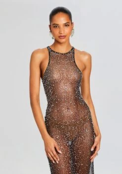 Step into the spotlight with our mesmerizing Brandy Dress. This dress is a true showstopper, designed to make you feel like royalty at any event. Each sequin shimmers and shines, catching the light with every step you take. The sheer fabric adds an element of allure, while the high neck exudes elegance and sophistication. Perfect for glamorous occasions such as red carpet events, galas, or formal dinners, this gown is guaranteed to turn heads and leave a lasting impression. Pair it with statement earrings and strappy heels for a look that’s sure to command attention. Shown here in Black/Silver.