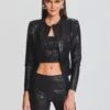 Outshine the rest in the Bryant Top. This long-sleeve crop top features an abstract beaded wave pattern and u-back. It’s finished with an exposed zipper at center back. Complete the look with our matching Emory Skirt. Shown here in Black/Gunmetal.