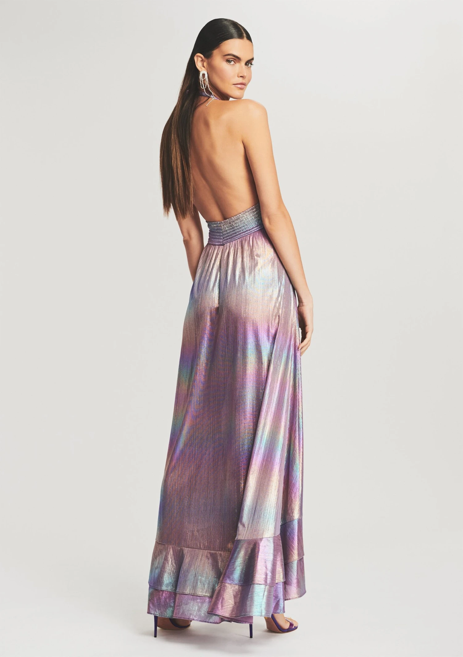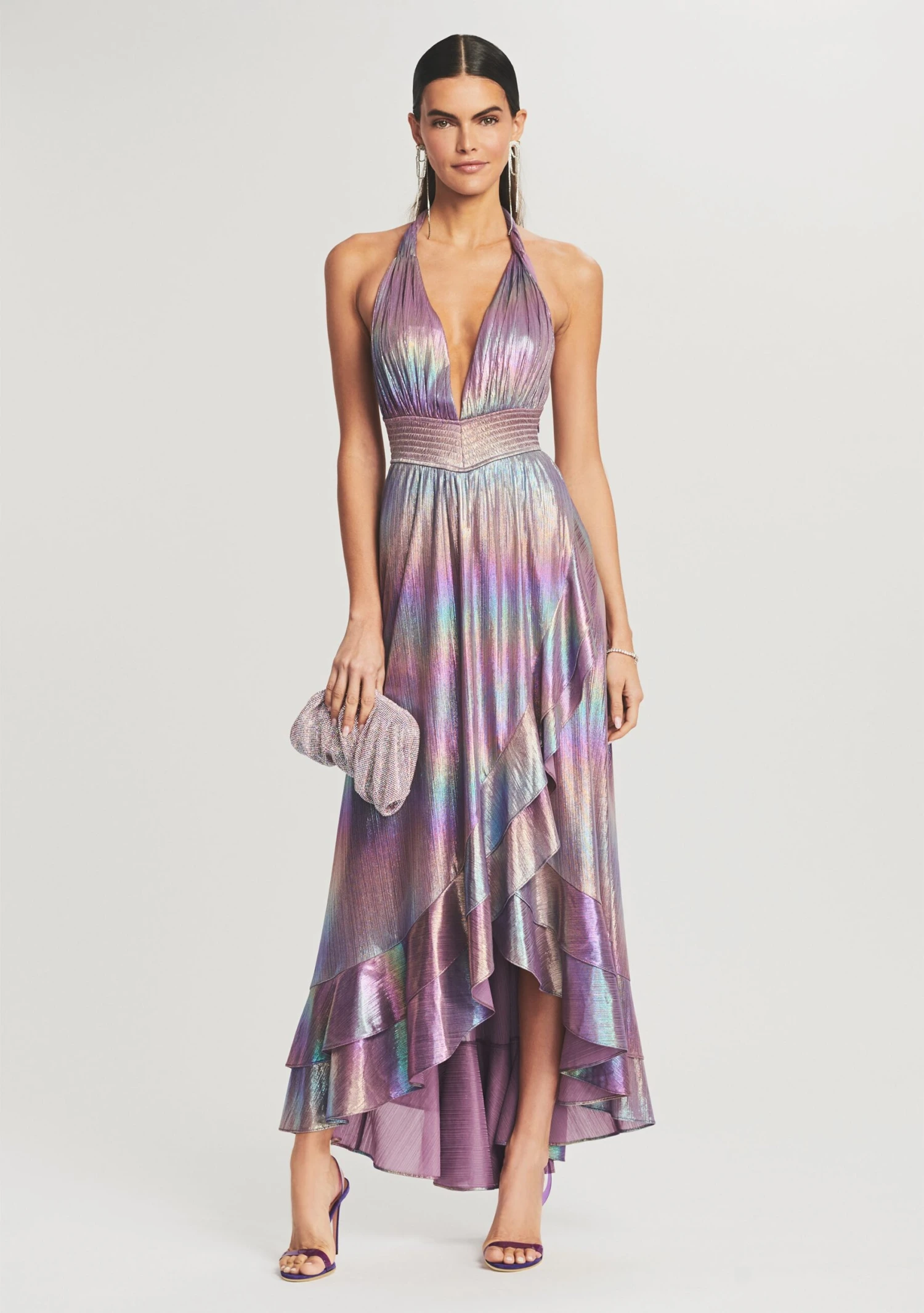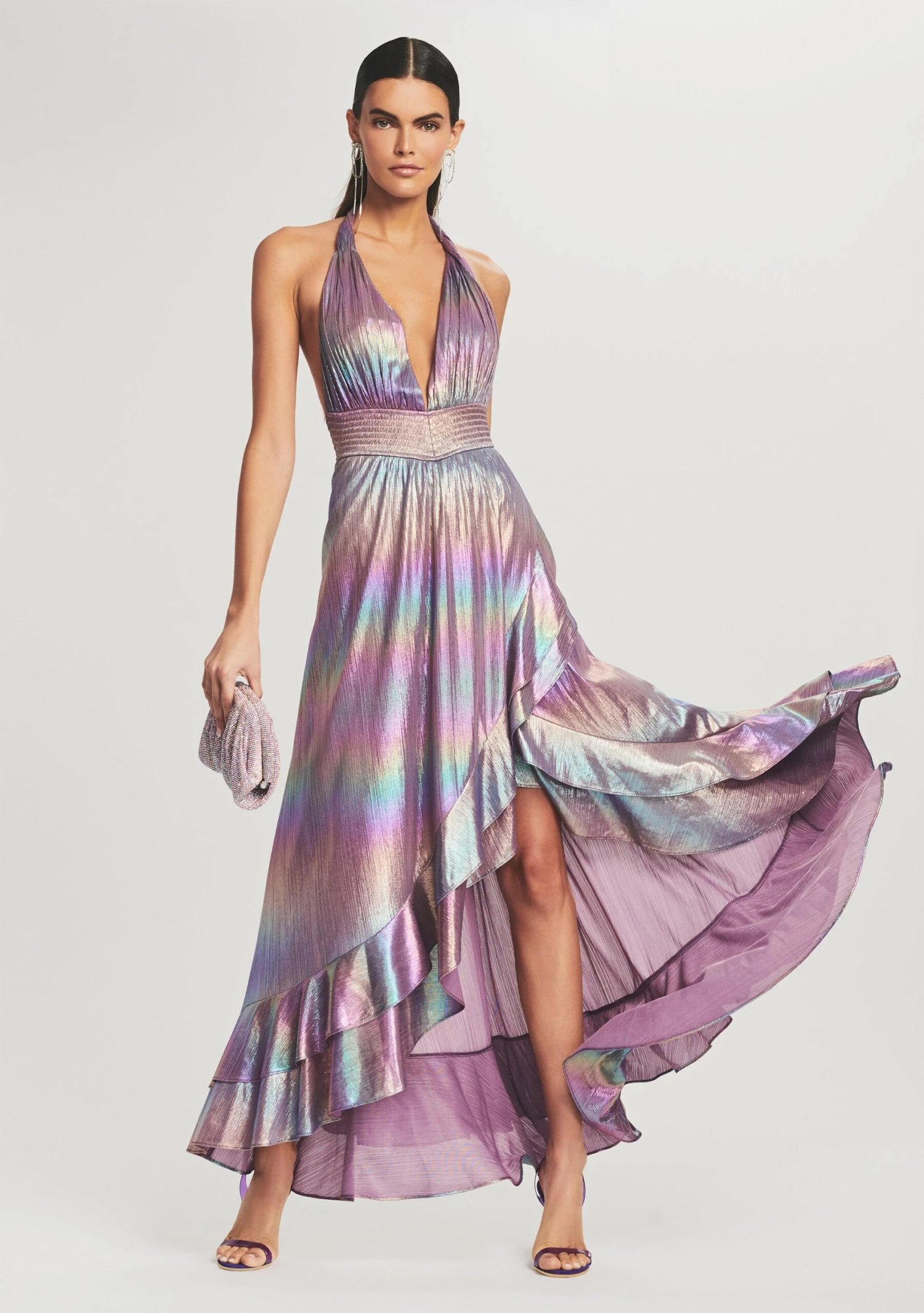 Sophisticated by design, reach for the Calico Maxi Dress for your next formal affair. The halter neck, lamé silhouette features a smocked waist and a daring deep v-neckline. Its asymmetrical ruffled hem is complemented by high-low detailing. Shown here in Lilac Aurora.