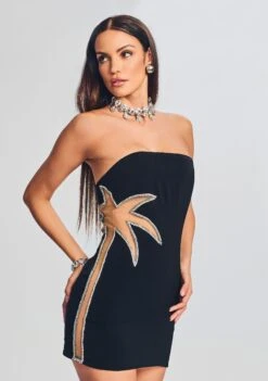 Be the life of the party with our captivating Carmie Dress that embodies signature eveningwear style with a tropical twist. This strapless, side-zip mini silhouette features a mesh palm motif with crystal-embellished lining that gives a spectacular sparkle to this classic little black dress. Shown here in Black/Silver.