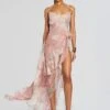 Elevate your style with our breathtaking Carmine Dress, adorned with intricate embellishments and sheer panels for a stunningly unique look. Designed to captivate, this dress features a daring slit in the back and barely there straps that exude elegance and allure. Shown here in Tannin.
