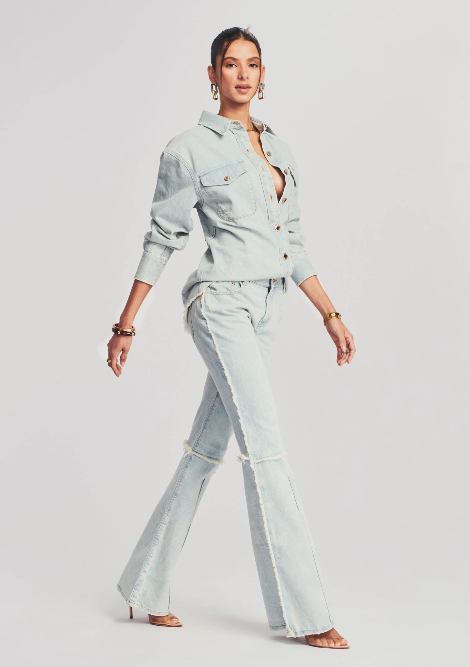Exclusively sold at Retrofête, our Cilian Pant is a light-wash, classic five-pocket flare jean with a slight twist. There’s light distressing along the side seams and just under the knee; this added seam makes for easy hemming without losing the full flare effect. Shown here in Blue Dawn.