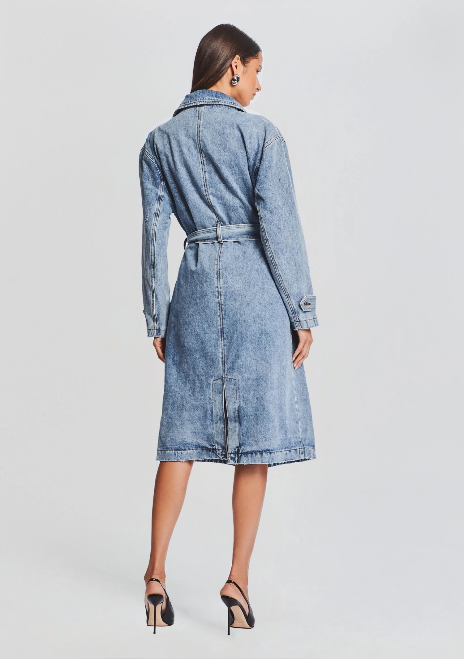 Introducing our chic Dakota Jacket—a versatile wardrobe essential that seamlessly transitions from day to night, ensuring you stay cute and stylish around the clock. The classic denim fabric offers a timeless appeal, while the trench coat design adds a touch of sophistication to elevate your look. Make every day a stylish affair, turning heads and capturing hearts with this iconic coat. Shown here in Alani.