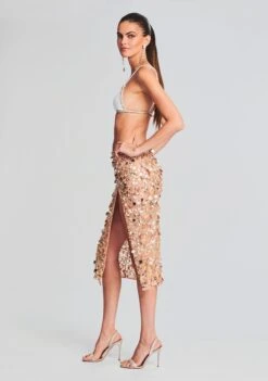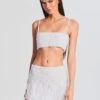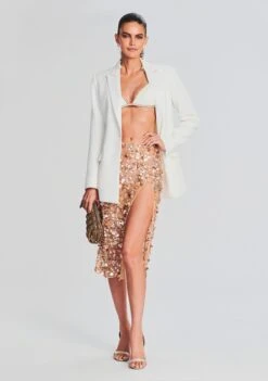 Our Deja Bra is a must. This double-clasped bra features crystal adornments lining the silhouette. Shown here in White/Gold.