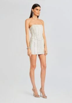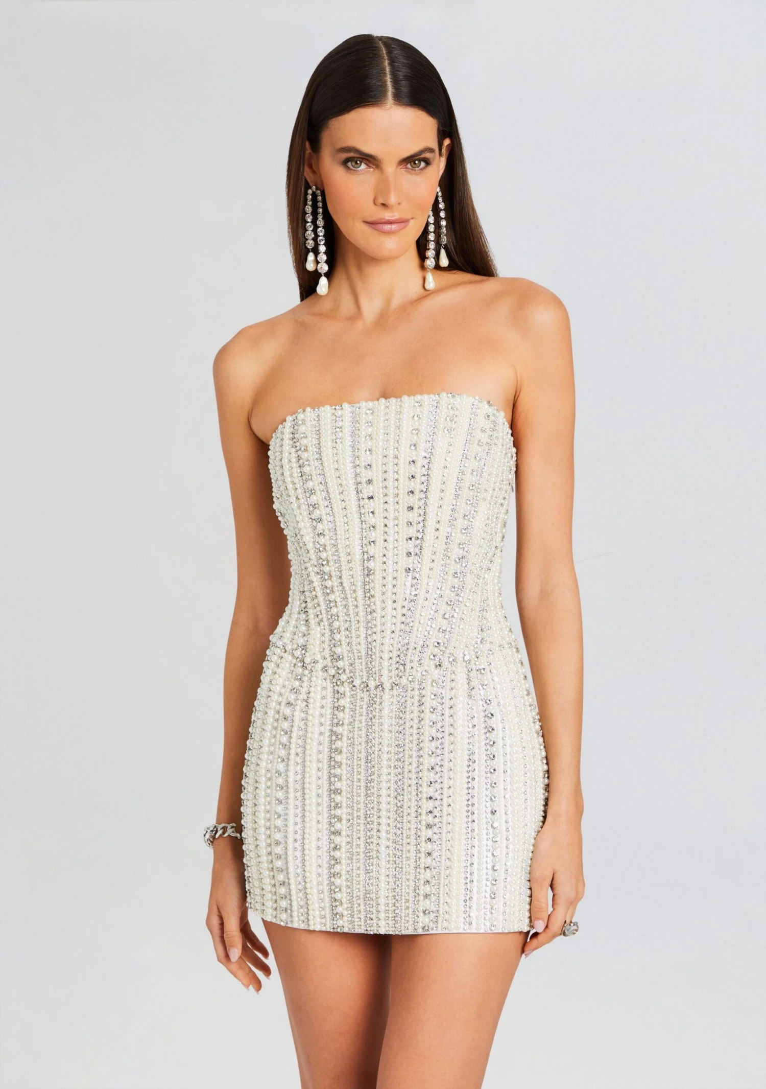 Embrace the allure of timeless sophistication with our Esmeray Dress, a versatile piece perfect for the modern bride or those seeking a show-stopping look at cocktail parties. This dress is a celebration of style, blending opulent embellishments with a chic, strapless silhouette. Shown here in White.