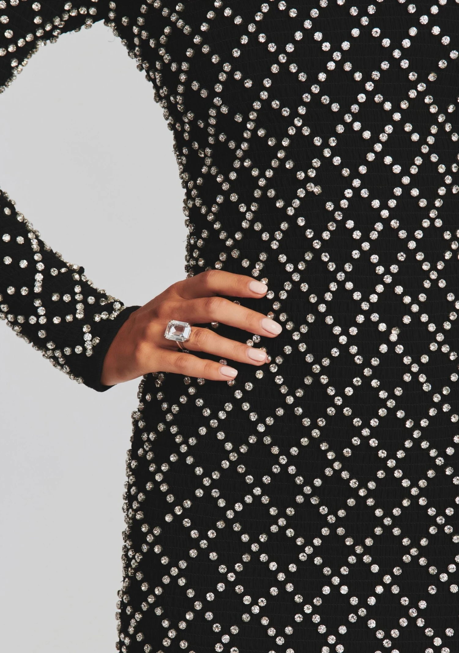 Emerge on the scene with our Harlowe dress. Shirred for a second skin fit, this long-sleeve mini dazzles with rhinestones, with an invisible back zipper acting as final touch. Shown here in Black/Silver Grid.