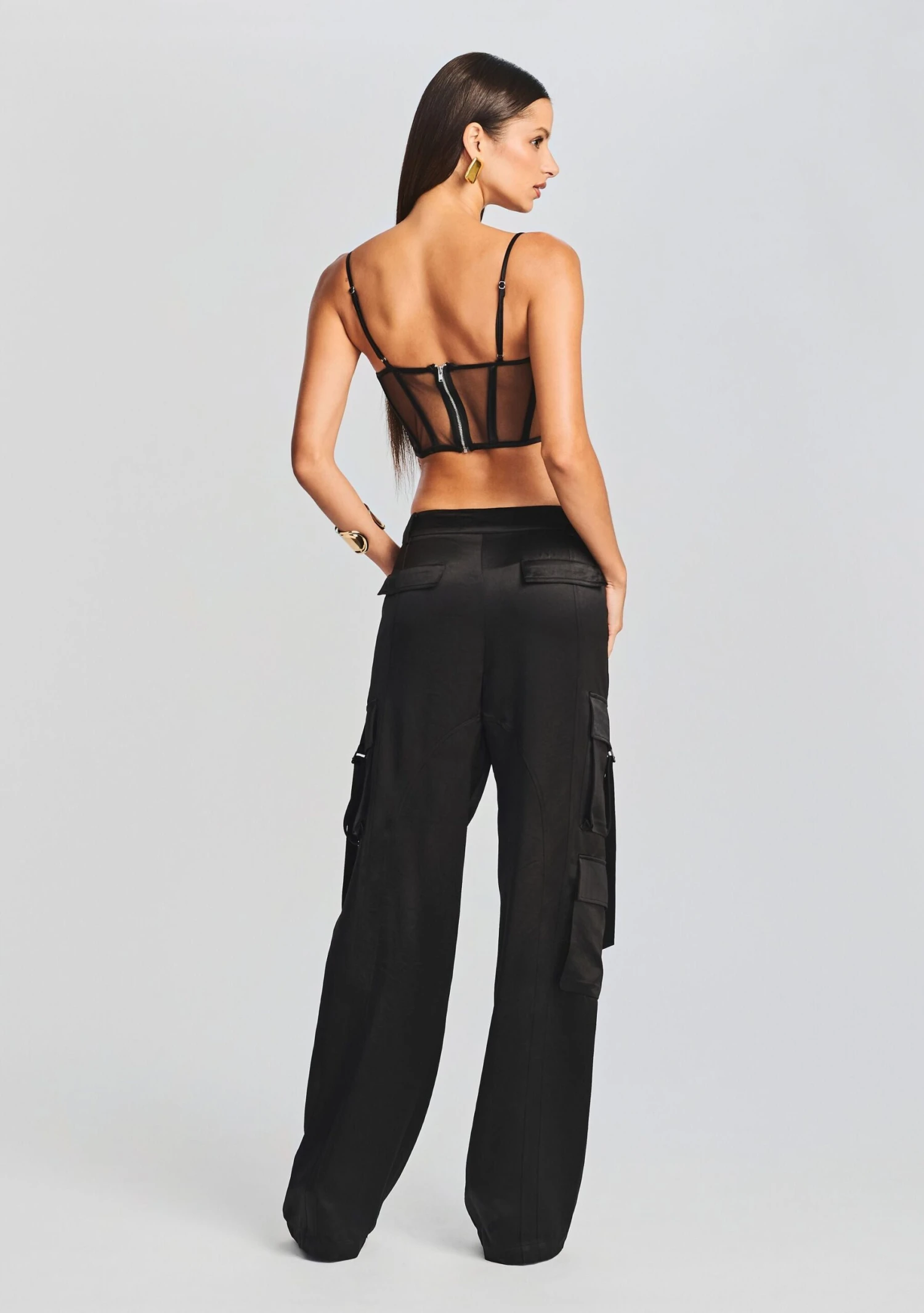 Make our Holly Top your night out go-to. This silk corset-inspired top features a cowl neckline and a sheer bodice. The style is finalized with barely-there straps and lined boning throughout. Shown here in Black.