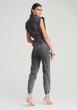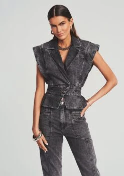Add some ‘80s edge to your summer looks with our Jackie Vest. This collared silhouette boasts a boxy shape complemented with structured short sleeves. The denim style’s cinched waist is accentuated with button closures and a lightly ruffled hem. Shown here in Hematite.
