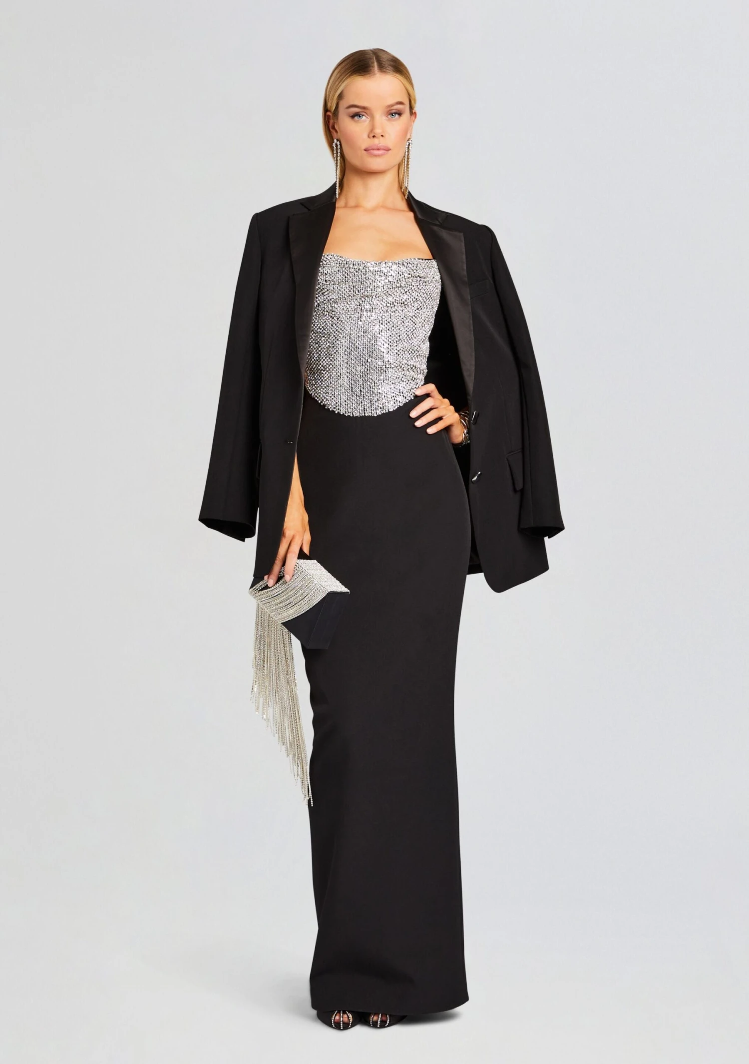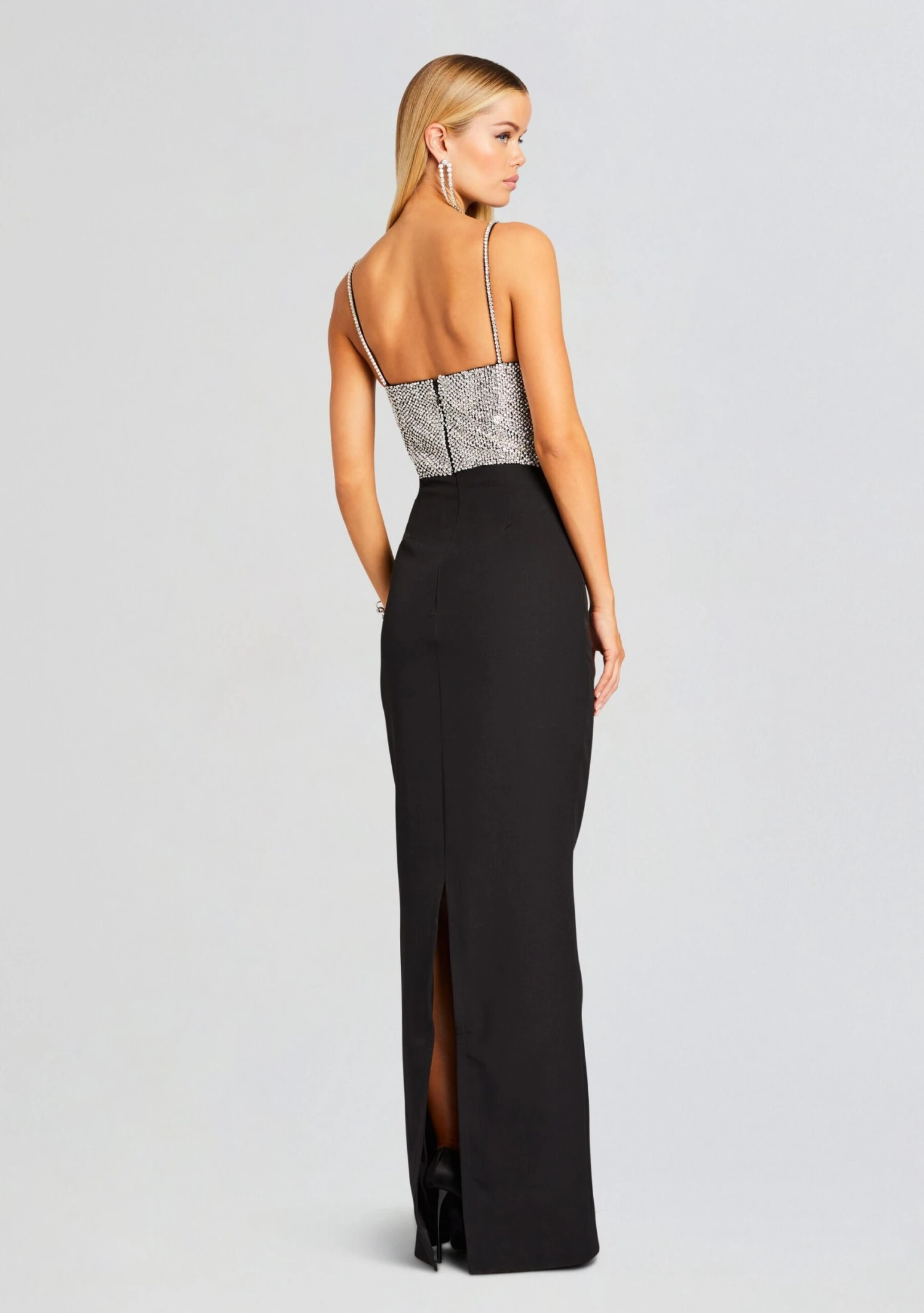 Introducing ourJazlyn Dress, a breathtaking masterpiece designed to embrace your curves with unparalleled grace and allure. This gown redefines sophistication, boasting an embellished top that’s not just flattering but truly special and unique. Shown here in Black/Silver.