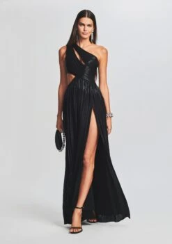Embrace your inner goddess in our Jolene Dress! Crafted in lustrous lamé, this silhouette features ruched panels on the bodice and a maxi-length skirt. The single shoulder silhouette, cutouts at front and side bodice, and thigh-high side slit provide this style with a seductively feminine feel. The gown is finished with an invisible side zip closure. Shown here in Black.Â