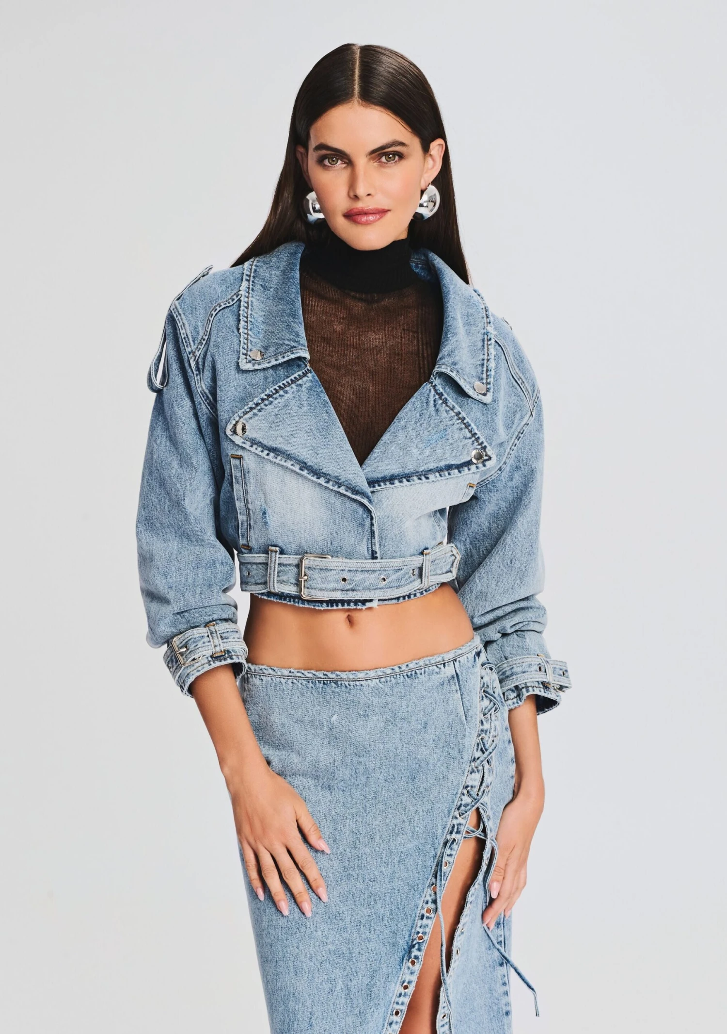 Achieve denim goals in our Josyln Jacket. This moto-style cropped denim jacket features button clasped lapels, a belt-buckled hem, and coordinating sleeve cuffs. Shown here in Alani.