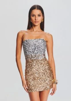 Introducing our stunning Katalina dress– the epitome of glamour and style. This mini dress is designed to turn heads and make a statement at any event. The seamless blend of silver and gold ombre sequins creates a dazzling effect that catches the light from every angle, ensuring you shine brighter than the rest. Shown here in Silver Gold Ombre.