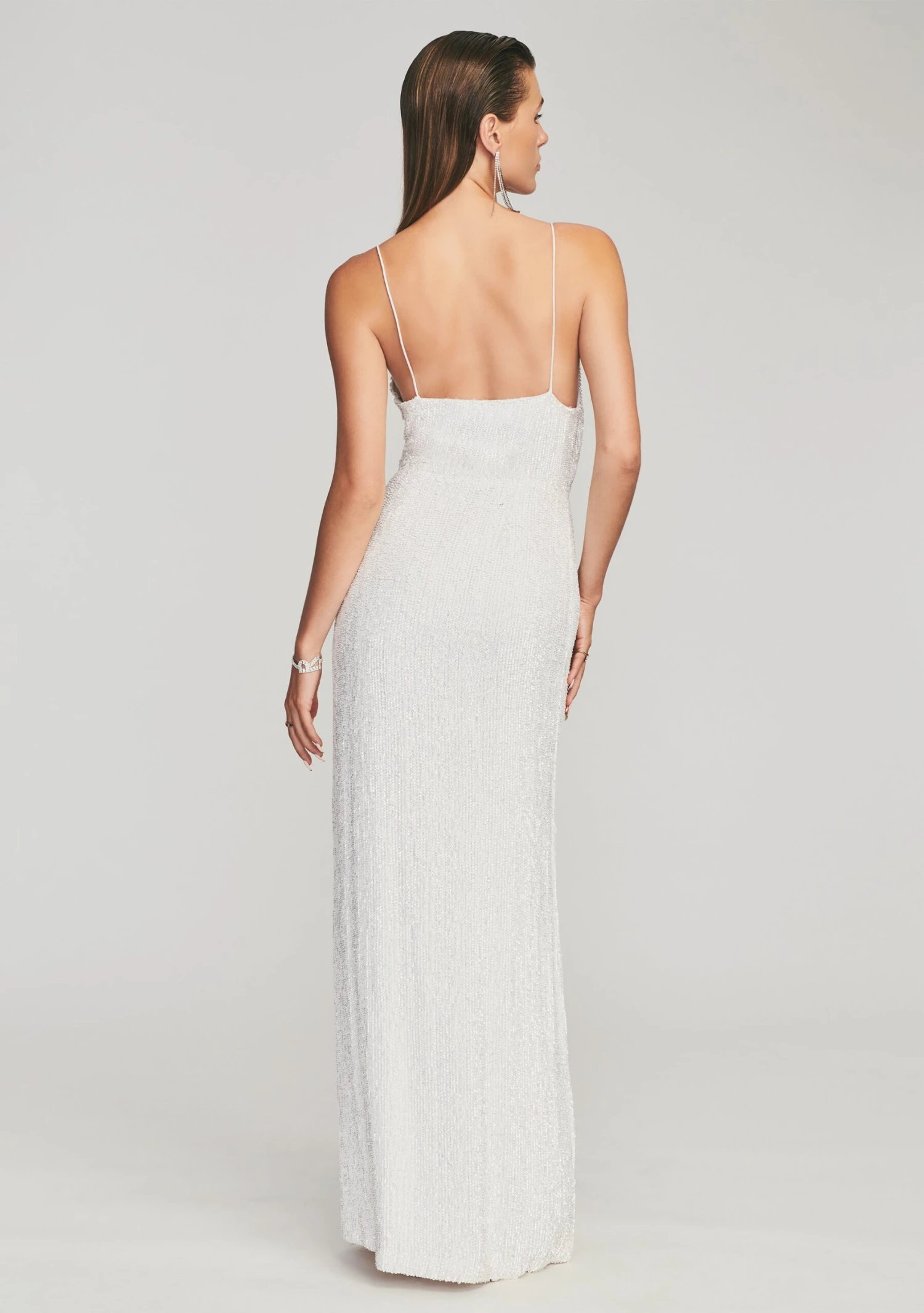 The Katya Dress embodies classic elegance. The hand-sewn sequin maxi features a cowl neck and spaghetti straps. The slimming silhouette is completed with a dramatic slit on the side. Shown here in Moonglow White.