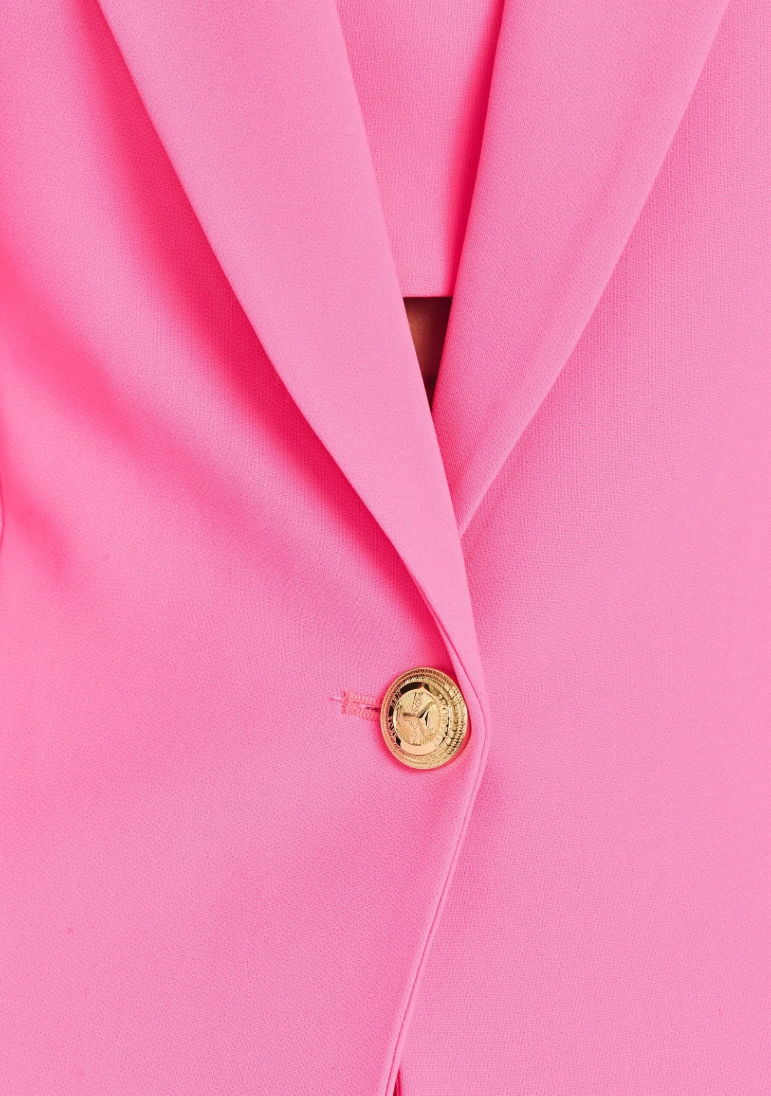 Make a sophisticated style statement with our Kristen Blazer. This formal suit jacket features oversized lapels, side flap pockets, and a single button closure at its center. Shown here in Hyper Pink.