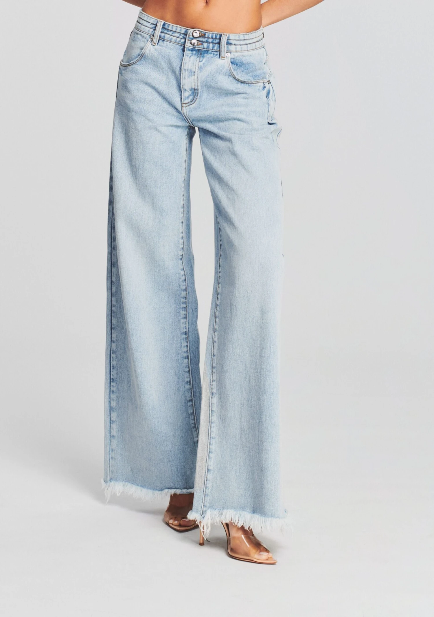 The Lorena Jean is a light-wash, medium-rise jean with an exaggerated wide leg. It’s complete with frayed hems and a two button closure at the waist. Shown here in Vivid.