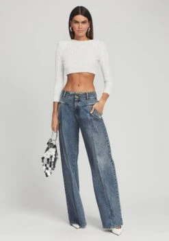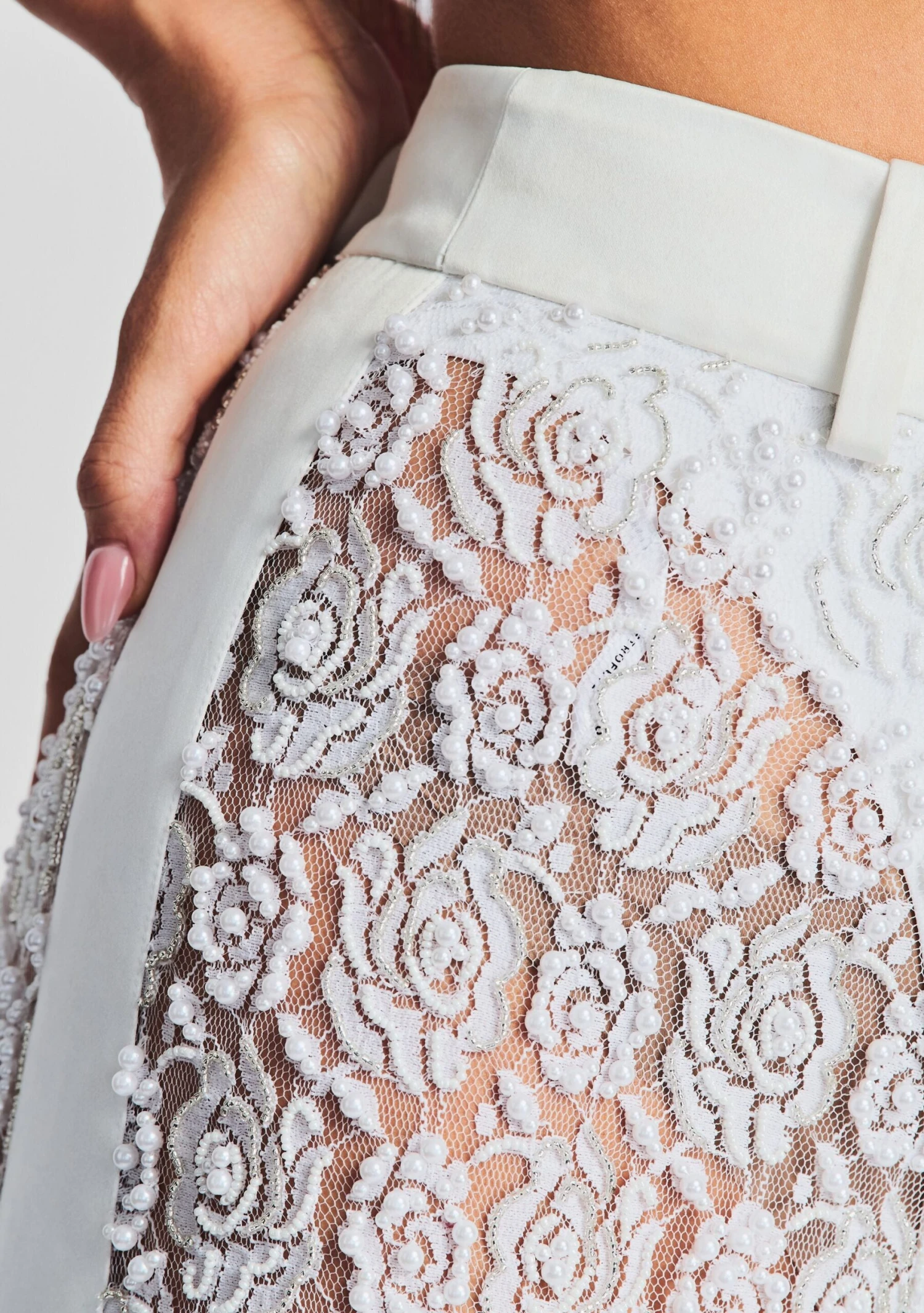 Exude romanticism in our Lulu Pant. This floral-laced style features delicate pearl embellishments and a built in undergarment. A sleek side trim down each leg and waistband adds a hint of sophistication. Shown here in White.