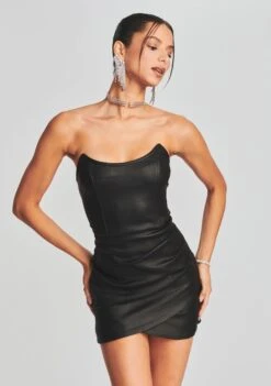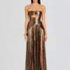 Catch eyes in our Lyanna Dress. This strapless maxi gown features a pleated bodice, coordinating skirt, and a bright metallic finish. Shown here in Purple/Gold.