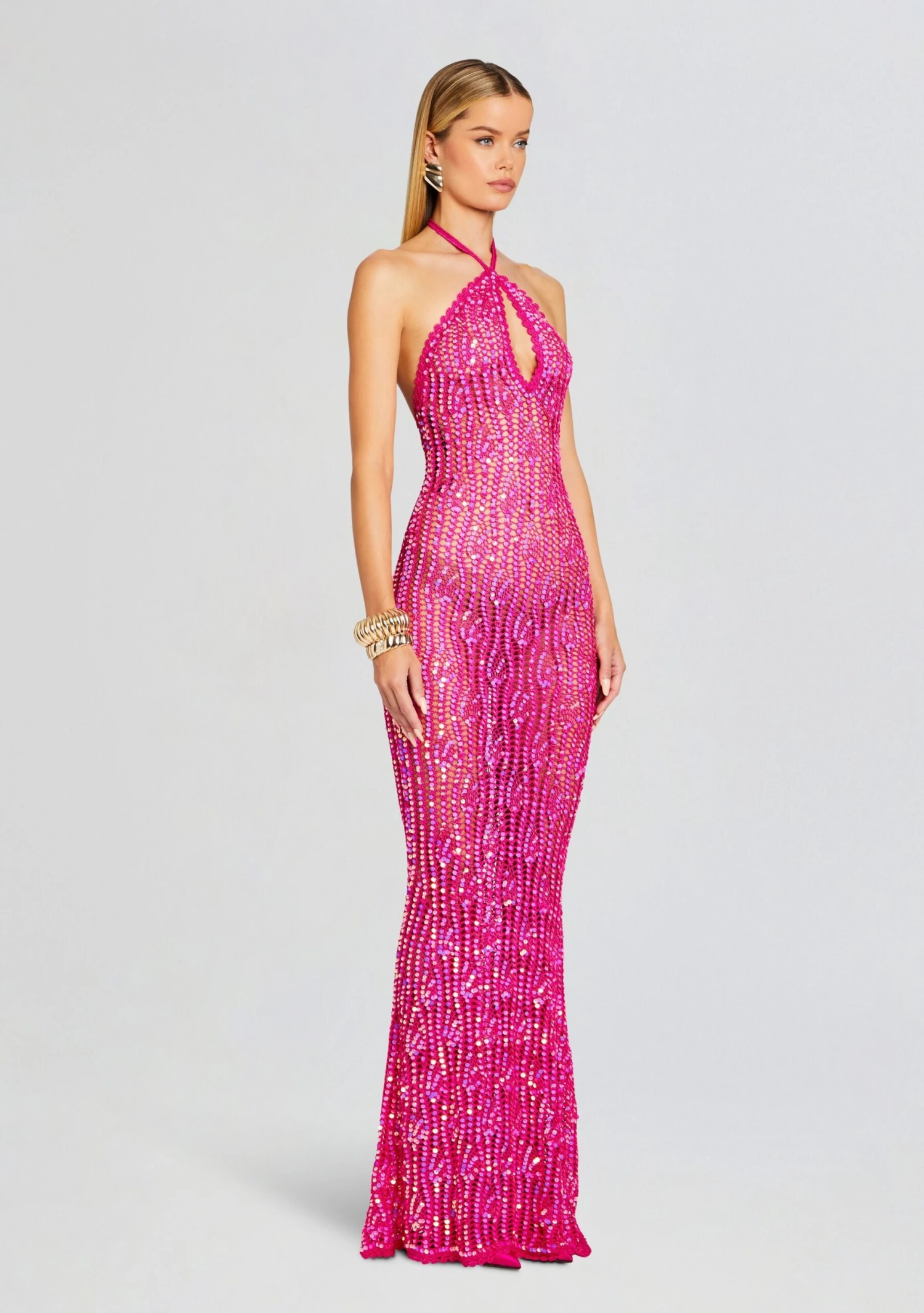 Indulge in both sophistication and allure with our Massie Dress. This dress is a timeless piece that effortlessly blends the playful allure of crochet and pink with the elegance of sequin embellishments, creating a look that’s both chic and glamorous. Shown here in Paradise Pink.