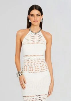 Indulge in resort-inspired glamour with our Mesa Dress. The halter neck, designed with with flirty pearl like embellishments, accentuates the neckline with an understated yet luxurious appeal. Adorned with embellishments, this dress exudes a captivating allure that effortlessly complements the laid-back vibes of a resort getaway. Shown here in Iridescent White.