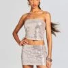 Make your entrance in our Millie Denim Bra Top. This cropped bra top features a sweetheart bodice and a margarita glass-inspired back zipper. Shown here in Sea.