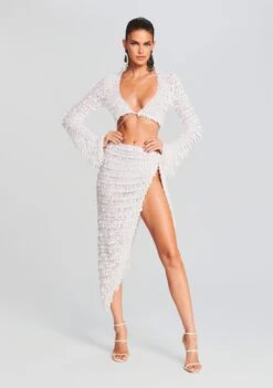 Stop the show in our Monae Dress. This stunning blue mini dress features rows of blue paillette sequins contrasted by rhinestones, crystals, and beads for a dazzling display of texture. It’s complete with low back and hidden center back zipper. Shown here in Aqua Blue.