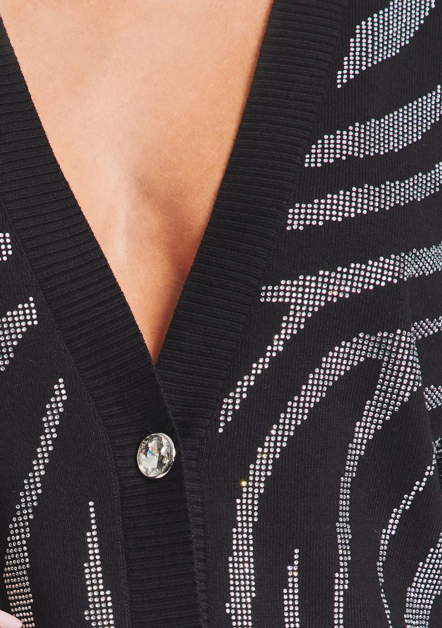 Elevate your style game with our sequin embellished Natalya Knit Cardigan – a fusion of edginess, chic fashion, and comfort. Whether you’re dressing up for a night out or adding flair to your daily ensemble, this cardigan has you covered. Shown here in Black/Silver Zebra.