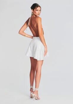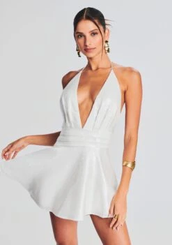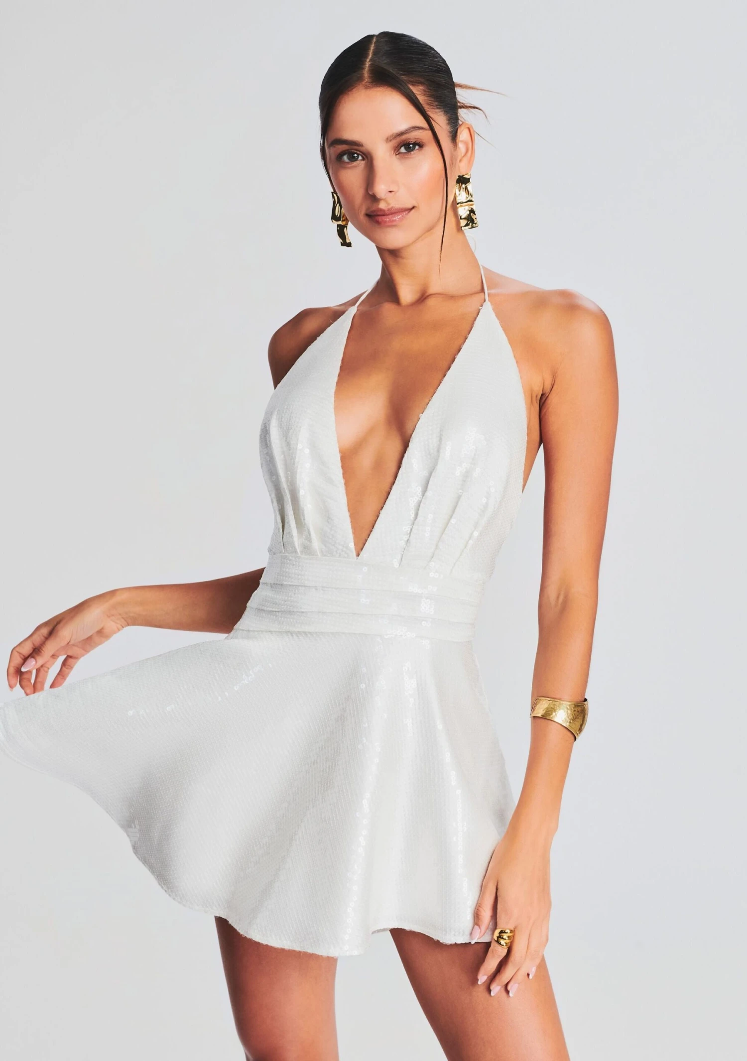 Elevate your style with our Natasha Sequin Dress. This sparkling mini dress features bright statement sequins throughout its pleated mini design, an openback, and a V-neck neckline. Harmonize your outfit with our Tia Earrings for a golden glow. Shown here in White/Sequin.
