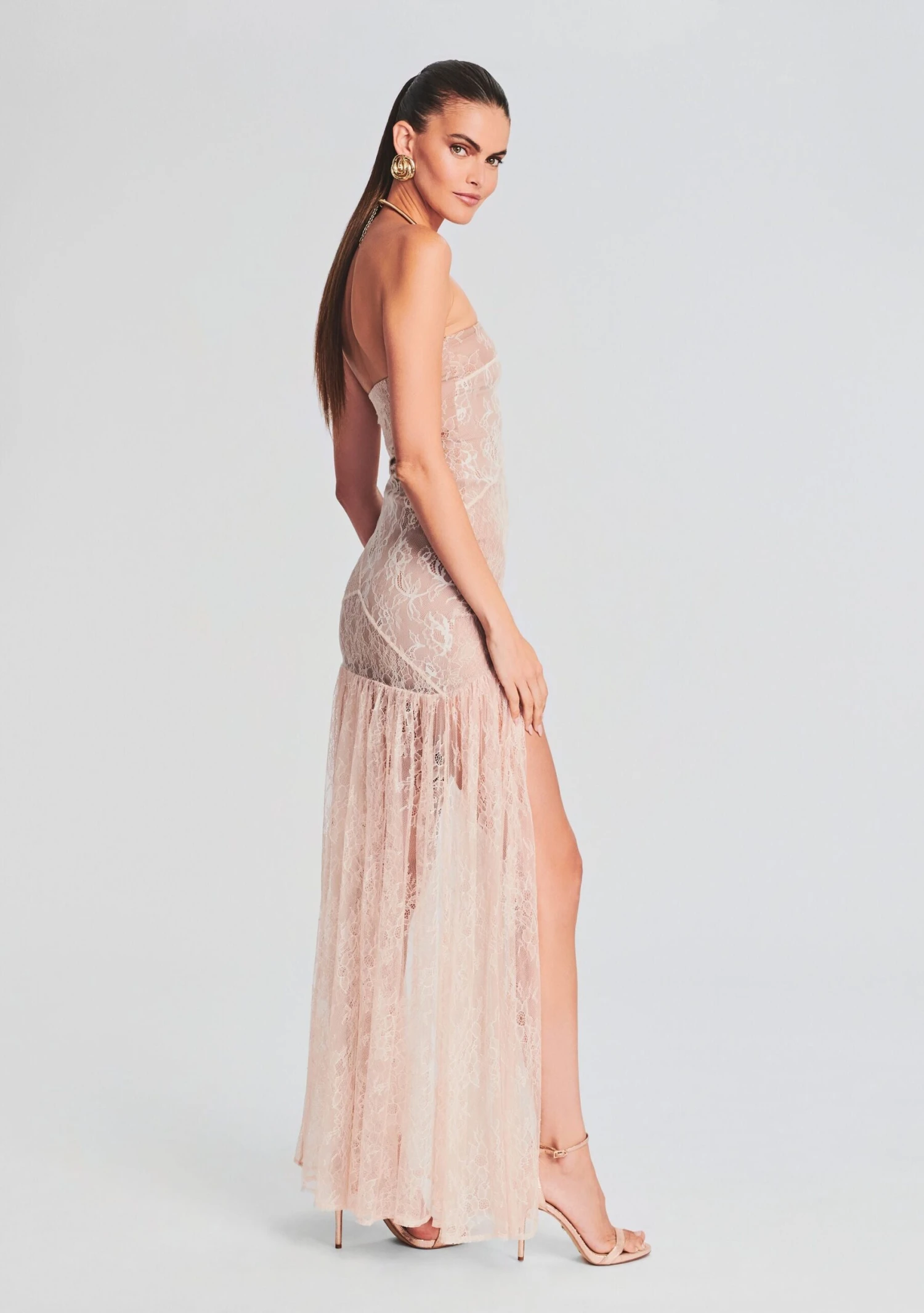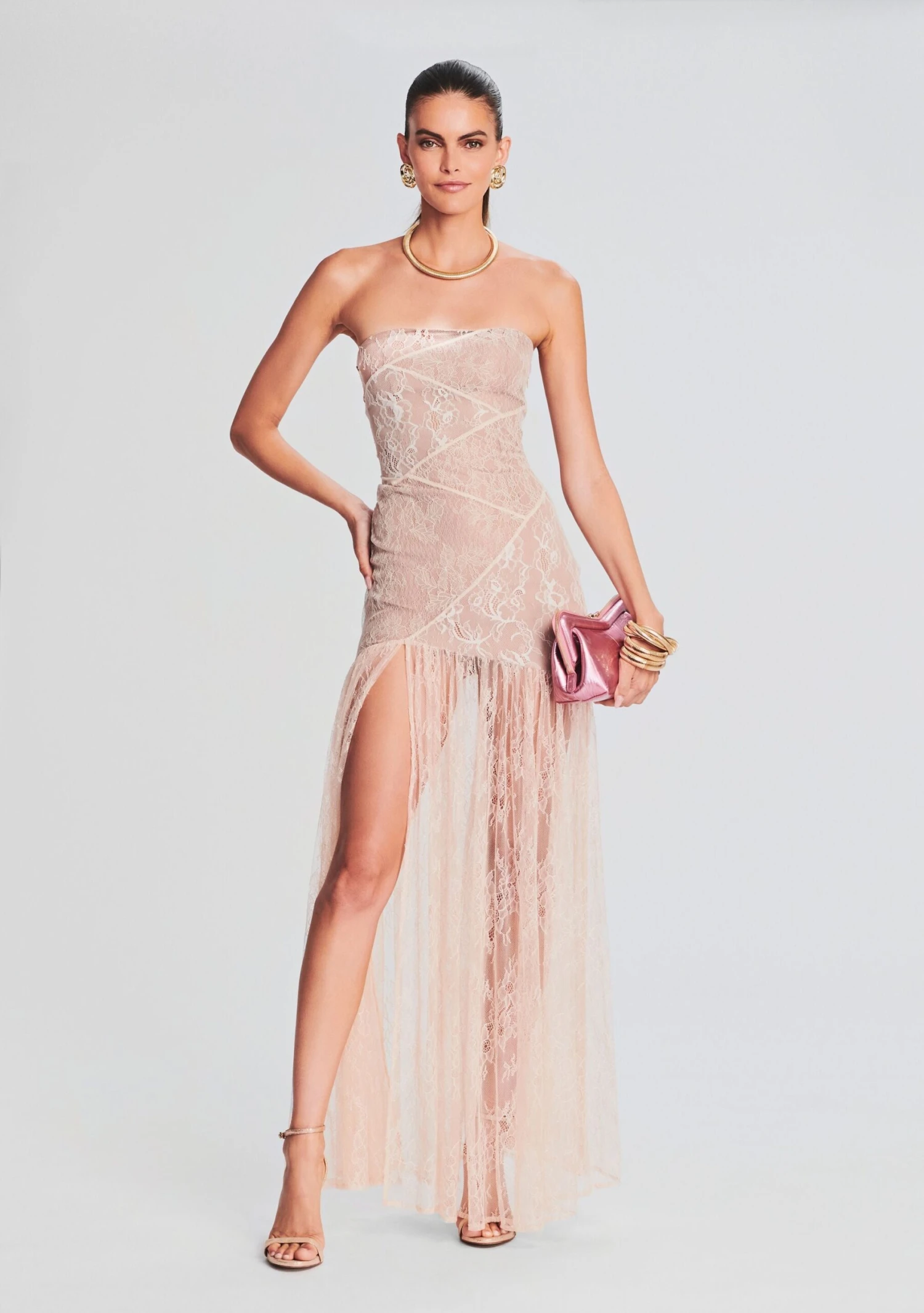 Exude elegance in our Nicole Lace Dress. This semi-sheer strapless maxi dress features floral stitched lacework and a matching draped skirt with a side slit. Shown here in Dusty Peach.