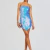 Stand out in our Nikki Dress. This sequined, long-sleeved mini shows off a bold, palm-inspired design, with shoulder pads and a hidden back zipper. This sleek and sultry design features a round neckline, fitted 3/4 sleeves, and an ultra-short hemline. Shown here in Tropical Palm.