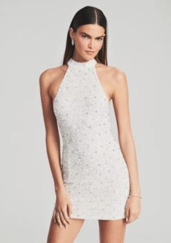 Turn heads in the Olivia Dress. The form fitting mini is sure to command any room. With its halter design, featuring a slinky open back, the seductive silhouette is finished with a button closure at the neck and an invisible zipper closure down the body. Shown here in White.