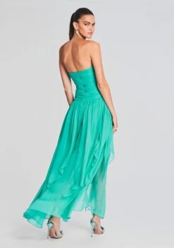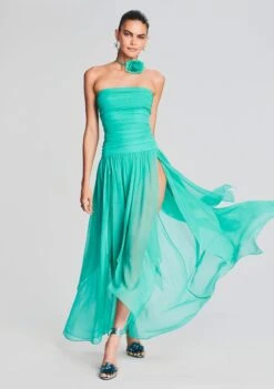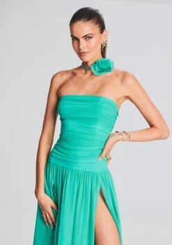 Go bold in our Perola Silk Chiffon Dress. This airy style fuses a strapless, ruched top and a draped, side-slit skirt that flows with every move. A matching floral tie necklace acts as the final touch. Shown here in Sea Foam.