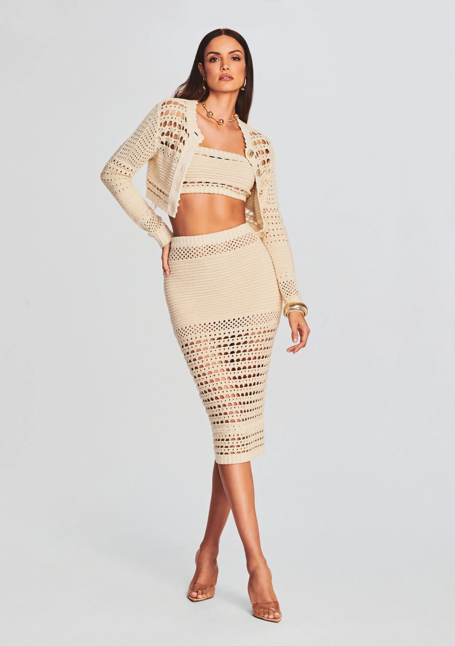 Channel vacation vibes with our Raya Crochet Skirt. This contemporary piece takes crochet to new heights with its cross-stitch cutouts that add an extra layer of artistry and allure. Round out your outfit with our Luiz Crochet Top and Nico Crochet Cardigan to achieve the ultimate coordinated look. Shown here in Ivory/Gold.