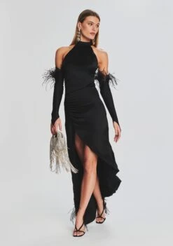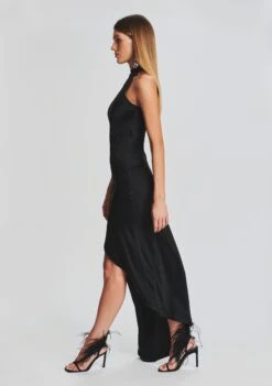 Designed for a modern goddess, the Sab Dress makes an impact in its body-hugging satin silhouette. Defined by a leg-baring high-low hemline and a halter mock-neck, the design is equal parts sophisticated and sexy. Side ruching and an invisible zip closure keep the fit sleek. Shown here in Black.