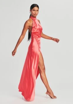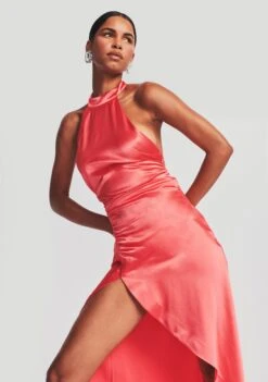 Designed for a modern goddess, the Sabrina Dress makes an impact in its body-hugging satin silhouette. Defined by a leg-baring, high-low hemline and a halter mock-neck, the design is equal parts sophisticated and sexy. Side ruching and an invisible zip closure keep the fit sleek. Shown here in Coral.