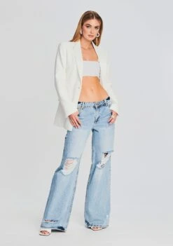 Taking inspiration from our Millie Jacket, the Simone Jacket boasts a more distressed feel with a shredded raw hem, providing a contrasting edge to the feminine design. The jacket features two side pockets and mid length sleeves. Crafted in a soft, stretch denim. Shown here in Bailey.