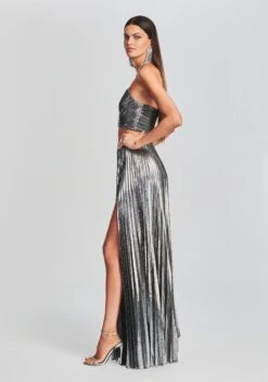 Our Sophia Top will quickly become the silver lining of your next night out. Zipped along the back, this strapless top wraps the bustier in lacquered pleats for a no slip sweetheart. Pair back to our Cressida Skirt for an award-winning look. Shown here in Gunmetal.