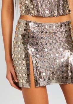 Experience the perfect blend of style and drama with our Tamar Skirt. With its captivating chainmail design, bold embellishments, and two eye-catching slits, this show stopper is your key to making a dramatic entrance and commanding attention from across the room. Shown here in Silver/Gold.