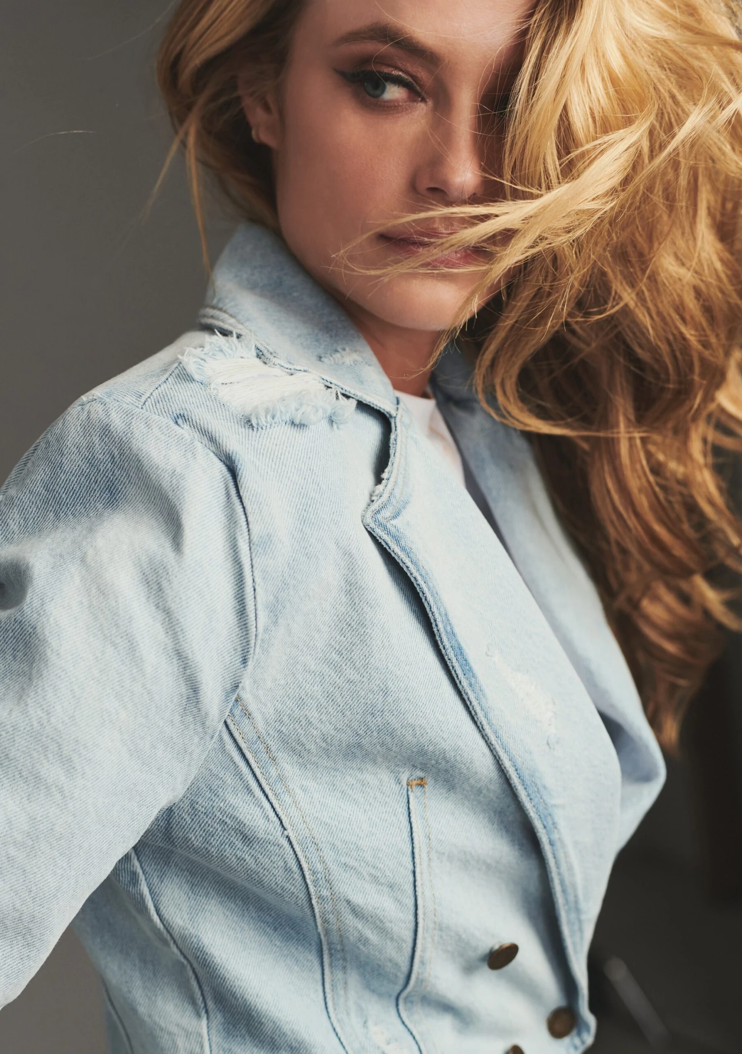 Our Vivienne Jacket offers a rugged interpretation on the classic tailored blazer. Crafted in luxe Italian denim, the double-breasted style features light shoulder padding and subtle distressing throughout. A timeless and versatile staple, the jacket adds a relaxed touch to any look. Shown here in Laguna.
